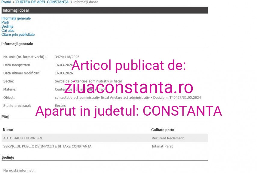 Pe 16 martie 2026, Curtea de Apel Constanța a înregistrat procesul în recurs al firmei Auto Haus Tudor SRL împotriva Serviciului Public de Impozite și Taxe Constanța.Potrivit datelor de pe Portalul Instanțelor de Judecată, Curtea de Apel Constanța nu a stabilit când va avea loc primul termen.Pe fond, Auto Haus Tudor SRL a solicitat anularea parțială a Deciziei de impunere nr. T45427/31.05.2024, prin care a fost obligată să plătească taxa de afișaj în scop de reclamă și publicitate, stabilită pentru un număr de 11 panouri.În apărare, reclamanta a menționat că panourile aduse în discuție nu au caracter publicitar, ci unul strict informativ și de orientare a clienților în incinta punctului de lucru.„S-a susținut că înscrisurile de tipul „RECEPȚIE”, „MECANICĂ”, „###### ITP” sau „VOPSITORIE” sunt necesare pentru identificarea compartimentelor service-ului auto, nefiind destinate atragerii de noi clienți sau promovării activității în sensul art. 478 din Codul fiscal.Reclamanta a invocat faptul că publicitatea presupune un mesaj persuasiv, în timp ce panourile sale sunt simple indicatoare tehnice de destinație a spațiilor.”De partea cealaltă, SPIT Constanța a învederat că panourile în cauză depășesc sfera simplei identificări, întrucât prin dimensiuni, amplasament și conținut, acestea informează publicul asupra întregului spectru de servicii oferite de reclamantă, având ca efect atragerea clientelei și promovarea afacerii.Ce a reținut Tribunalul Constanța „În drept, potrivit art. 478 alin. (1) din Legea nr. 227/2015 privind Codul fiscal, orice persoană care utilizează un panou, un afișaj sau o structură de afișaj pentru reclamă și publicitate datorează plata taxei anuale către bugetul local.Prezentarea structurată a serviciilor (Mecanică, Vopsitorie, ITP) pe panouri distincte de mari dimensiuni depășește nevoia de simplă orientare în spațiu, constituind o formă de expunere a capacităților tehnice ale firmei cu scopul evident de a convinge potențialii utilizatori de diversitatea și profesionalismul serviciilor oferite. În acest sens, panourile contestate intră sub incidența noțiunii de publicitate, întrucât informează publicul asupra destinației spațiilor, promovează activitatea diversificată a reclamantei și indică prezența a mai multor puncte de lucru pentru fiecare activitate, ceea ce este de natură să atragă clientela prin sugerarea unei capacități de preluare rapidă a comenzilor.Alegațiile reclamantei privind cheltuielile de reclamă și publicitate (deductibilitatea acestora) sunt fără relevanță în prezenta cauză, întrucât acestea se referă la raporturile juridice reglementate de art. 477 din Codul fiscal (taxa pe servicii), în timp ce în speță se analizează taxa de afișaj reglementată de art. 478, care are ca obiect material deținerea și utilizarea suportului fizic de afișaj pe teritoriul unității administrativ-teritoriale.Prin urmare, actul administrativ fiscal este legal și temeinic sub aspectul stabilirii obligațiilor fiscale reprezentând taxa de afișaj, motiv pentru care acțiunea este neîntemeiată.”Despre Auto Haus Tudor SRL Potrivit termene.ro, firma a fost înființată în anul 2005, are sediul social pe strada Haiducului nr. 97 din Constanța și obiectul de activitate este „comerț cu amănuntul de piese și accesorii pentru autovehicule”.Asociat unic este Tudor Dănuț, care figurează și ca administrator, alături de Tudor Adina.Firma a raportat pentru 2024 o cifră de afaceri de peste 22 milioane lei, profit de peste 270.000 lei, datorii de peste 8,5 milioane lei și 54 de salariați.Conform termene.ro, Auto Haus Tudor SRL are 755 de achiziții directe și 48 de licitații câștigate.Sursă motivare: ReJust și Portal Just Legea 190 din 2018, la articolul 7, menţionează că activitatea jurnalistică este exonerată de la unele prevederi ale Regulamentului GDPR, dacă se păstrează un echilibru între libertatea de exprimare şi protecţia datelor cu caracter personal. Informațiile din prezentul articol sunt de interes public și sunt obținute din surse publice deschise. Citește și: