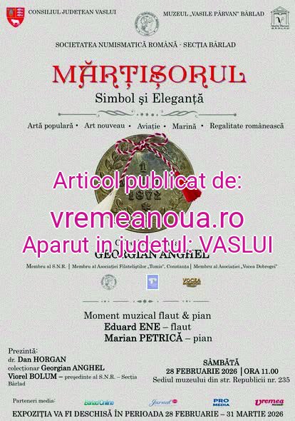 EXPOZITIE… Muzeul „Vasile Pârvan” din Bârlad, cu sprijinul Societãtii Numismatice Românã- Sectia Bârlad, invitã publicul la vernisajul expozitiei „MÃRȚIȘORUL – SIMBOL si ELEGANTÔ, care va avea loc sâmbãtã, 28 februarie 2026, ora 11.00. Evenimentul va fi prezentat de dr. Dan Horgan, cãpitanul Georgian Anghel – membru al Societãtii Numismatice Române, al Asociatiei Filatelistilor „Tomis” Constanta si al Asociatiei „Vocea Dobrogei”- precum si de Viorel Bolum, presedintele Societãtii Numismatice Române – Sectia Bârlad.