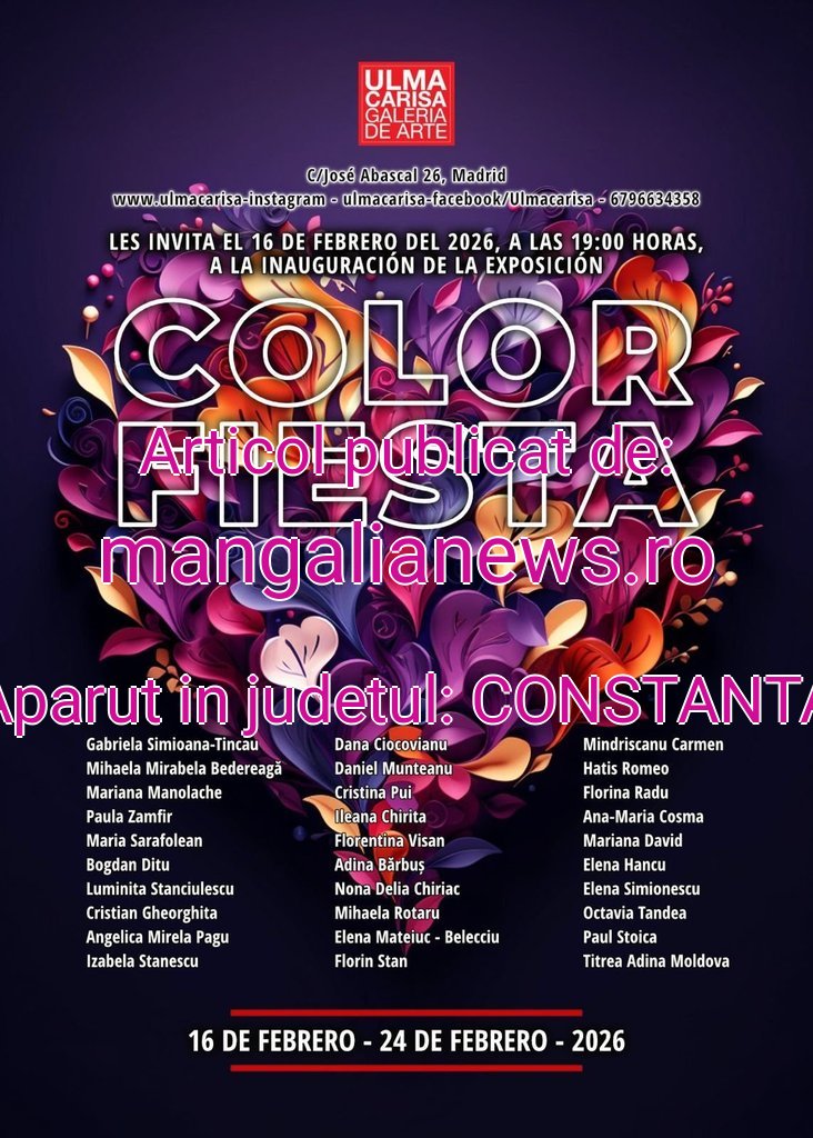 Galeria Ulmacarisa găzduiește expoziția„Color Fiesta – ediția a III-a” , un eveniment artistic care reunește 30 de artiști plastici din România, prezentând lucrări de pictură în ulei și acrilic, tapiserie și icoane pe lemn. Expoziția propune un dialog vizual între tradiție și contemporaneitate, sub semnul culorii ca limbaj universal.„Color Fiesta” este un proiect de punte culturală între România și Spania, aducând în prim-plan diversitatea expresiilor artistice românești și forța lor de a crea conexiuni dincolo de granițe. Publicul este invitat să descopere un parcurs expozițional bogat, în care fiecare lucrare devine o mărturie a identității, memoriei și sensibilității artistului.Expoziția poate fi vizitată la Galeria Ulmacarisa din Madrid, iar vernisajul are loc în prezența curatorului Adina Moldova Țitrea.Evenimentul se adresează publicului larg și comunității românești din diaspora, ca un prilej de întâlnire prin artă, memorie și apartenența culturală. (A transmis ).