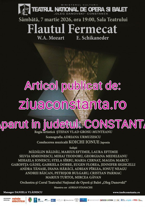 Luna martie debutează cu opera „Flautul Fermecat” de W.A. Mozart. Teatrul Național de Operă și Balet „Oleg Danovski” invită publicul la acest eveniment, sâmbătă, 7 martie 2026, începând cu ora 19:00.„Flautul fermecat” este o operă în două acte, a cărei muzică a fost compusă de Wolfgang Amadeus Mozart, pe un libret scris în limba germană de Emanuel Schikaneder. Premiera absolută a operei a avut loc la Viena, la Burgtheater, la data de 30 septembrie 1791, sub conducerea muzicală a compozitorului. Premiera la Teatrul Național de Operă și Balet „Oleg Danovski” a avut loc pe 15 iunie 2014Regia artistică: ȘTEFAN VLAD GROSU-MUNTEANUScenografia: ADRIANA URMUZESCUSoliști:MĂDĂLIN BĂLDĂU, MARIUS EFTIMIE, LAURA EFTIMIE, SILVIA SIMIONESCU, MIHAI TEODORU, GEORGIANA MEDELEANU, MIHAELA IONESCU, STELA SÎRBU, MARIA CERNAT, MAGDA MARCU, GAROFIȚA GÂDEI, GABRIELA DOBRE, EUGEN FLOREA, JENNIFER SIGHCELLI, ANDRA TĂNASE, DIANA HĂRĂCI, ADRIAN PÎRLEA, IONUȚ NEAGU, ANDREI BĂICAN, PETRIȘOR BULGARU, CRISTIAN PARMAC, MARIUS TURTOI, MIRCEA GĂVANConducerea muzicală: KOICHI INOUE – JaponiaOrchestra și Corul Teatrului Național de Operă și Balet „Oleg Danovski”Maestru cor: ADRIAN STANACHECitește și Spectacolele săptămânii Teatrul Național de Operă și Balet „Oleg Danovski” din Constanța „Carmen” în turneu la Pitești și Ploiești și „O Sole Mio” în Sala Teatrului