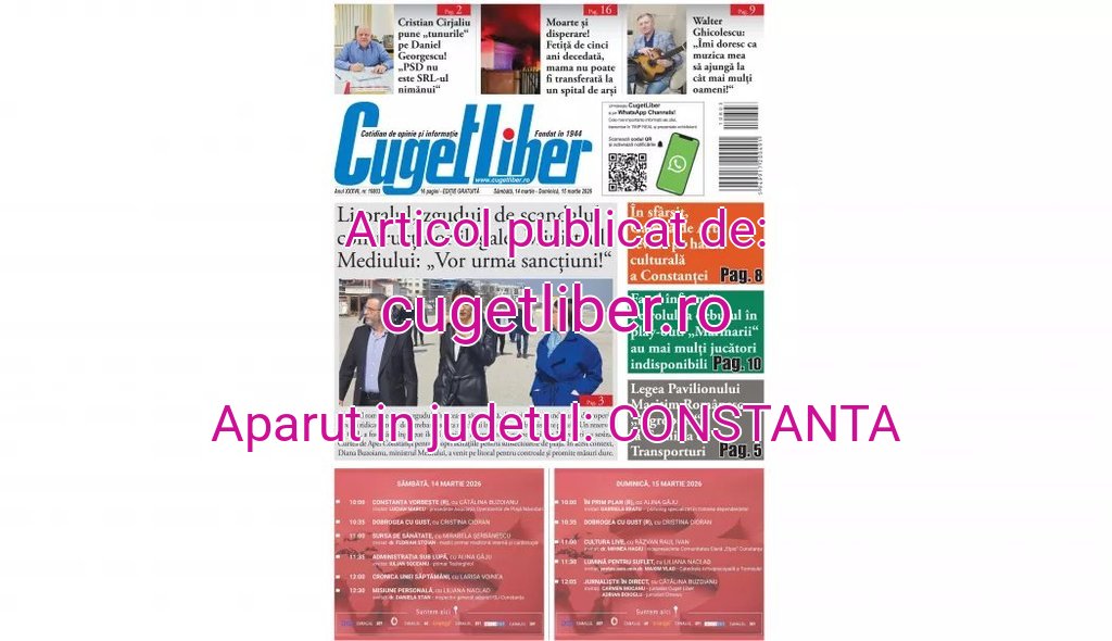 Iată titlurile zilei din data de 14 MARTIE ale ziarului CUGET LIBER! cugetliber.ro 13 martie 2026 Acțiune FacebookTwitterPinterestWhatsApp < 1 min citire Sursa: https://cugetliber.ro/stiri-actualitate-iata-titlurile-zilei-din-data-de-14-martie-ale-ziarului-cuget-liber-550209?utm_source=cugetliber&utm_medium=site&utm_content=ultima-ora&utm_campaign=Slider – ultima ora Acțiune FacebookTwitterPinterestWhatsApp Ultimă oră bzi.ro Panică în mai multe județe după boomul sonic al avioanelor de vânătoare. Zboruri supersonice de antrenament până pe 16 martie Robo Stiri - 13 martie 2026 ziuaconstanta.ro Întreruperi de curent programate în municipiul Constanța, duminică, 15 martie. Vizată zona Industrială Robo Stiri - 13 martie 2026 replicaonline.ro Un lider PNL acuză PSD de „înțelegeri pe sub masă“ cu AUR pentru a modifica legea bugetului Robo Stiri - 13 martie 2026 ziuaconstanta.ro Val de pensionări în magistratură: Președintele Nicușor Dan a semnat decretele de eliberare din funcție pentru șase judecători Robo Stiri - 13 martie 2026 Același autor cugetliber.ro Felicitări! Ei sunt câștigătorii concursului “Cuget Liber” și Cherhanaua Zarguzon 13 martie 2026 cugetliber.ro Iată titlurile zilei din data de 14 MARTIE ale ziarului CUGET LIBER! 13 martie 2026 cugetliber.ro Constănțenii, invitați să-și spună părerea. Rămân păcănelele în oraș sau nu? 13 martie 2026 cugetliber.ro La doar patru luni după moartea soției sale, Ion Zahiu a încetat din viață 13 martie 2026