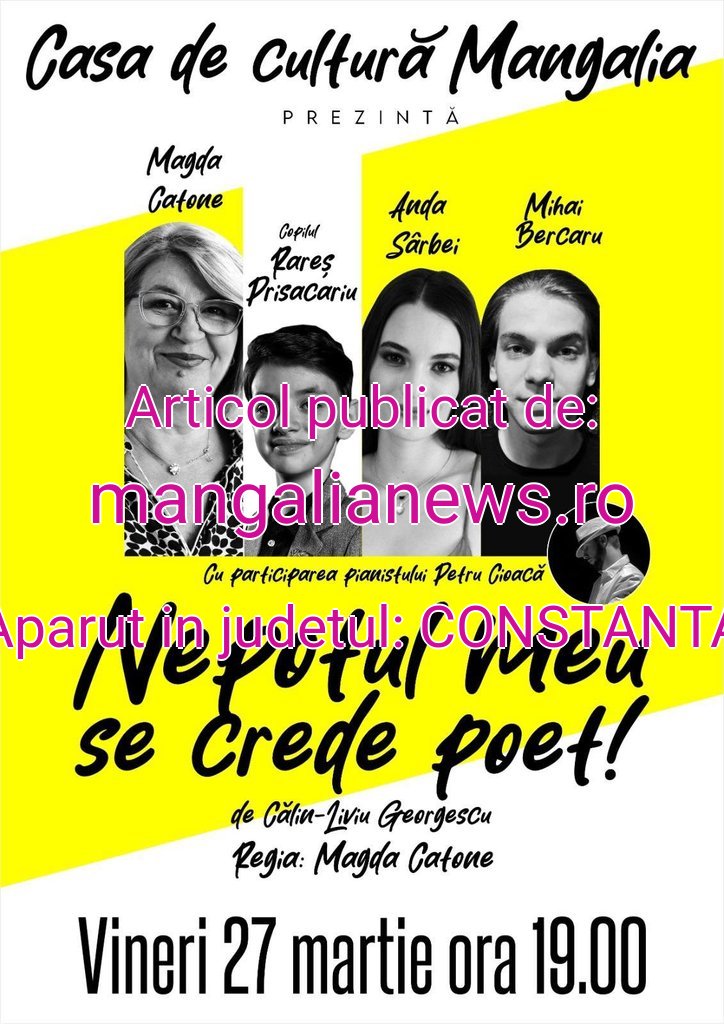 Nepotul meu se crede poet! Mangalia – Casa de Cultură, Vineri, 27 martie, ora 19:00. De Ziua Mondială a Teatrului, vă invităm să vă bucurați de o seară specială, dedicată artei scenei, alături de comedia„Nepotul meu se crede poet!” , scrisă de Călin-Liviu Georgescu și regizată de Magda Catone.Pe scenă îi veți vedea pe Magda Catone, Anda Sârbei, Mihai Bercaru și tânărul Rareș Prisăcariu, într-o poveste plină de umor și momente neașteptate. Pianistul Petru Ciocacă completează atmosfera cu intervenții muzicale care adaugă un plus de emoție și rafinament.Un spectacol despre familie, visuri și diferențele dintre generații, o combinație reușită de râs și reflecție, perfectă pentru o seară în care celebrăm teatrul.Rezervări:.Vă așteptăm să petrecem împreună o seară plină de emoție, voie bună și aplauze!