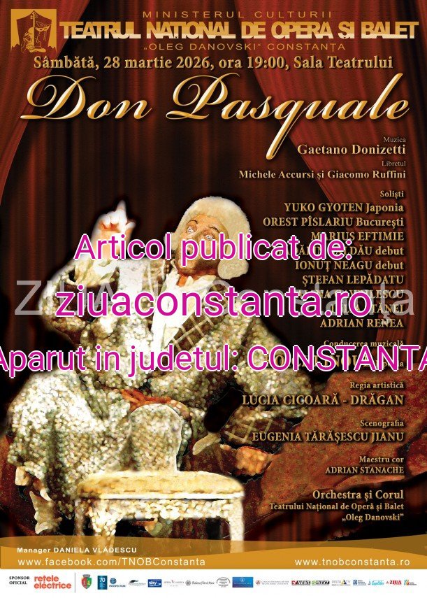 Ultimul spectacol al lunii martie are loc în această săptămână, la Teatrul Național de Operă și Balet „Oleg Danovski” Constanța. Sâmbătă, 28 martie 2026, de la ora 19:00, în Sala Teatrului se va pune în scenă spectacolul de operă „Don Pasquale”.„Don Pasquale” este o operă bufă în 3 acte de Gaetano Donizetti, după un libret de Michele Accursi și Giacomo Ruffini. Premiera mondială a operei a avut loc în 3 ianuarie 1843, la „Teatrul Italian” din Paris.Regia artistică: LUCIA CICOARĂ DRĂGANScenografia: EUGENIA TĂRĂŞESCU JIANUSoliști: YUKO GYOTEN – Japonia, OREST PÎSLARIU – București, MARIUS EFTIMIE, MĂDĂLIN BĂLDĂU debut, IONUȚ NEAGU debut, ȘTEFAN LEPĂDATU, DAIANA GAVRILESCU, IULIA STĂNEI, ADRIAN RENEAConducerea muzicală: KOICHI INOUE – JaponiaMaestru cor: ADRIAN STANACHEOrchestra și Corul Teatrului Național de Operă și Balet „Oleg Danovski”Citește și „Flautul Fermecat”, de W.A. Mozart, deschide luna martie la Teatrul național de Operă și Balet „Oleg Danovski” Constanța