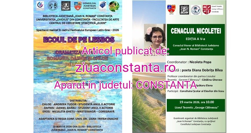 Biblioteca Județeană „Ioan N. Roman” Constanța organizează două evenimente joi, 19 martie 2026.De la ora 11:00, în Aula instituției Biroul de Informare Bibliografică Dobrogeană organizează o manifestare dedicată Festivalului European Latin-Grec, ediția 2026.Acesta este organizat de Universitatea din Lyon și are drept scop promovarea operelor literaturii grecești și latine prin lectură publică, saloane de carte, expoziții, spectacole și simpozioane organizate de instituții de cultură, universități și școli din lumea francofonă.Participantă din 2018 la acest festival, Biblioteca Județeană „Ioan N. Roman” Constanța propune anul acesta, la ediția XX a evenimentului, dramatizarea unui fragment din „Dafnis și Chloe” de Longos.Adaptarea și regia artistică a exercițiului teatral cu titlul „Ecoul de pe Lesbos” aparține conf. univ. dr. Dana Trifan-Enache. Actorii sunt studenți ai Facultății de Arte din Cadrul Universității „Ovidius” din Constanța.De asemenea, de la ora 10:00, la Liceul Teoretic „George Călinescu” din Constanța, va avea loc cea de-a V-a ediție a Cenaclului literar al Bibliotecii Județene „Ioan N. Roman” Constanța, „Cenaclul Nicoletei”.Proiectul reunește tineri care scriu poezie, eseu și care sunt dornici de a-și face cunoscute propriile producții literare colegilor, prietenilor, profesorilor și, bineînțeles, invitatului ediției – un scriitor consacrat. De data aceasta este invitată poeta Diana Dobrița Bîlea, membră a Filialei Dobrogea a Uniunii Scriitorilor Din România. Ea va exprima punctul său critic asupra textelor citite.Cenaclul Bibliotecii Județene „Ioan N. Roman” Constanța este coordonat de Nicoleta Popa, elevă în clasa a IX-a la Colegiul Pedagogic „Constantin Brătescu” din Constanța. Pentru întâlnirea din 19 martie a.c., din partea Liceului Teoretic „George Călinescu” vor fi prezenți profesorul coordonator, Cătălina Gherase, responsabilul CPPE, profesor Elena Spătaru, precum și membrii ai Consiliului Școlar al Elevilor Liceului Teoretic „George Călinescu”.Citește și:
