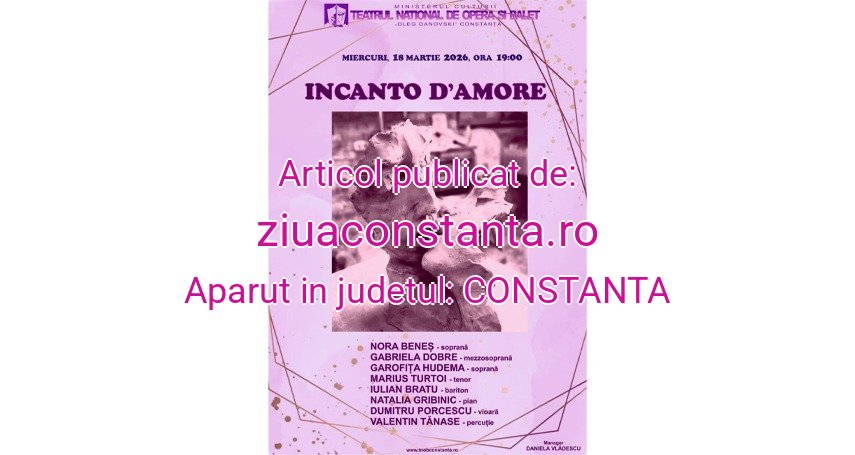 Teatrul Național de Operă și Balet „Oleg Danovski” din Constanța invită publicul la trei evenimente artistice programate în această săptămână, care vor avea loc atât în Foyerul Teatrului, cât și în Sala Teatrului.Programul include un recital și două spectacole de operă din repertoriul liric universal.INCANTO D’AMORE – Miercuri, 18 martie 2026, ora 19:00, Foyer Teatru SoliștiNORA BENEȘ soprană, GABRIELA DOBRE mezzosoprană, GAROFIȚA HUDEMA soprană, MARIUS TURTOI tenor, IULIAN BRATU bariton, NATALIA GRIBINIC pian, DUMITRU PORCESCU vioară, VALENTIN TĂNASE percuțieTOSCA – Sâmbătă, 21 martie 2026, ora 19:00, Sala Teatrului Regia și scenografia ȘTEFAN VLAD GROSU-MUNTEANUCostume ȘERBAN JIANUAsistent scenografie / decor ISA AIDINSoliști AKIKO HAYAKAWA Japonia, RĂZVAN SĂRARU, DANIEL POP, CRISTIAN CARAGEA, MIHAI TEODORU, ADRIAN CLINCIU, IULIAN BRATU, ADRIAN PÎRLEA, MIHAELA IONESCUConducerea muzicală KOICHI INOUE JaponiaMaestru cor ADRIAN STANACHEOrchestra și Corul Teatrului Național de Operă și Balet „Oleg Danovski”CARMEN – Duminică, 22 martie 2026, ora 19:00, Sala Teatrului Regia artistică: RĂSVANA CERNATScenografia: EUGENIA TĂRĂŞESCU JIANUCoregrafia: MIHAIL MOTOVILOVSoliști LUCIA MIHALACHE, DORU IFTENE, MARIUS EFTIMIE, ELENA ROTARI, IULIAN BRATU, MĂDĂLIN BĂLDĂU, MIHAELA IONESCU, STELA SÎRBU, MIHAI TEODORU, MIRCEA GĂVANConducerea muzicală CĂTĂLIN TOROPOCMaestru cor ADRIAN STANACHEOrchestra, Corul și Baletul Teatrului Național de Operă și Balet „Oleg Danovski”Biletele sunt disponibile la Agenția Teatrului și online pe www.tnobconstanta.ro/bilete [1] Pentru recitalul din Foyer, biletele pot fi achiziționate doar de la Agenția Teatrului.Citește și: