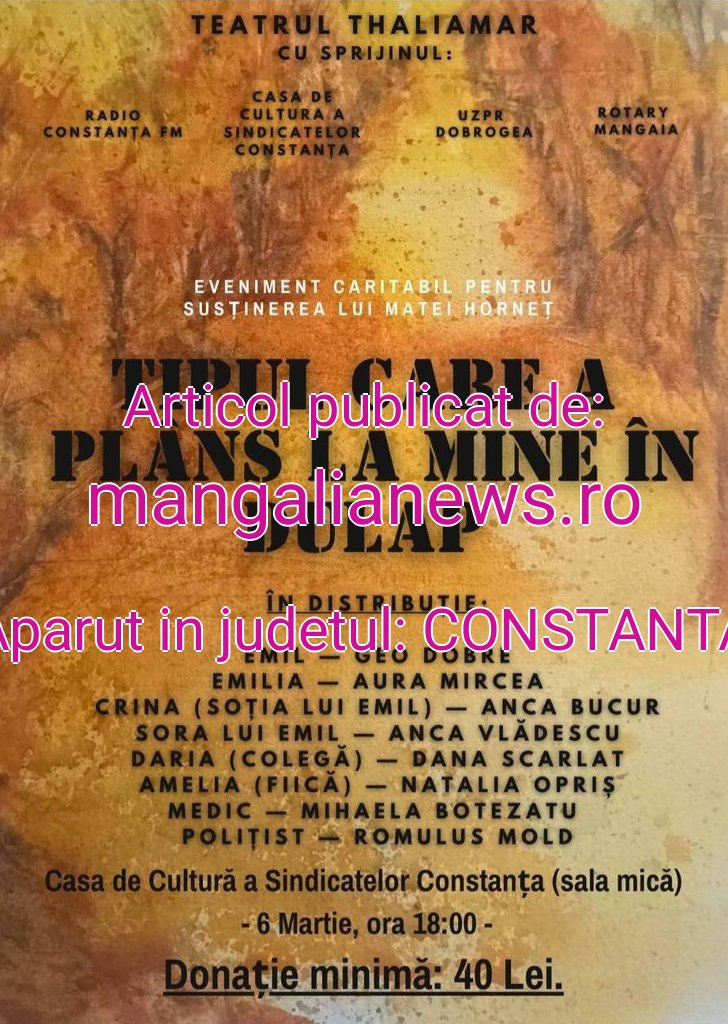 Vineri, 06 martie, ora 18:00, la Casa de Cultură a Sindicatelor Constanța – sala mică, are loc un spectacol de teatru susținut de Trupa Thaliamar din Mangalia.
